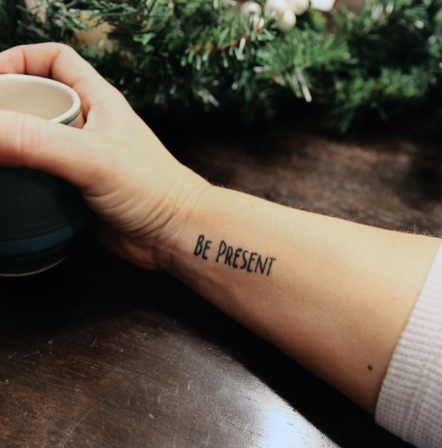 I met Danielle for the first time this summer. I had known of her, but finally got to meet her. I loved her commitment to the idea. She got BE PRESENT tattooed on her wrist. Now if ever there’s a constant reminder to set your phone down it had to be that right?